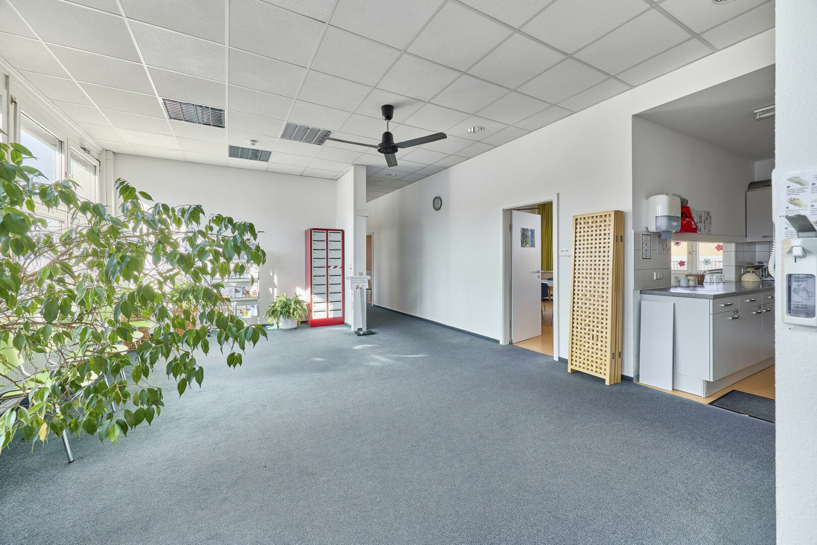 Die Innenausstattung umfasst robuste Industrie-Teppichböden in den Büroräumen sowie pflegeleichte Fliesenbeläge in Küche und Sanitärräumen. Großzügige Fensterflächen sorgen für helle Räume und ein angenehmes Arbeitsumfeld.